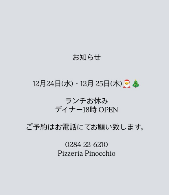 12/24(水)・25(木)🎄🎅 ランチお休み ディナー18時 OPEN