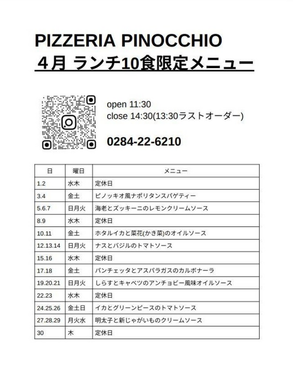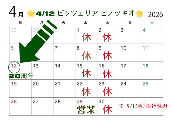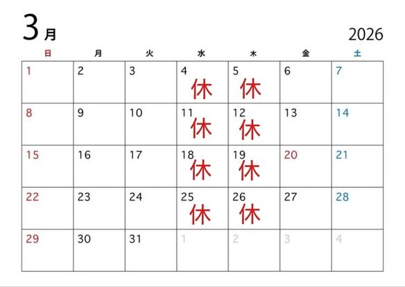 4月のお休み予定です。 変則なお休みがありますのでお気をつけ下さい。