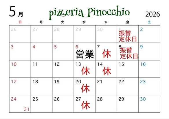 5月のお休み予定 変則なお休みがありますのでお気をつけ下さい。